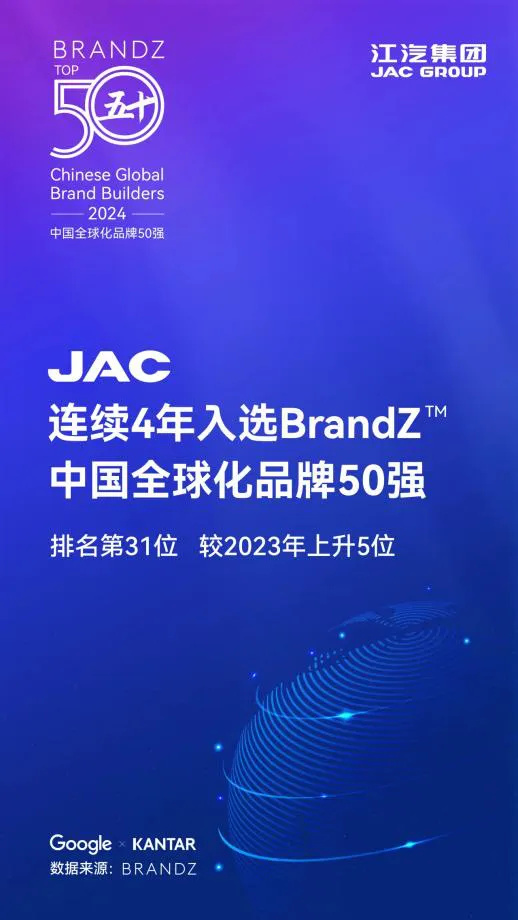 “JAC DAY海外品牌节”的开展也有效提升了江淮汽车品牌的影响力。全球知名品牌排行榜凯度BrandZ携手谷歌发布了《2024凯度BrandZ中国全球化品牌50强》榜单,江淮汽车位列中国全球化品牌第31位,中国汽车品牌第6位,这也是江淮汽车连续第四年荣登该权威榜单,体现强劲的品牌增长势头。